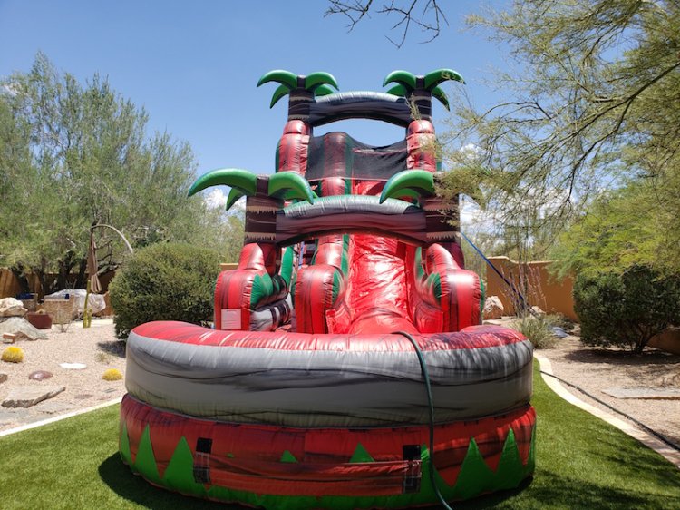 Rent the Ruby Red Crush Water Slide for your next waterslide party! With its beautiful palm trees and ruby red marble material this slide is an eye catcher! This slide has a pool on the end, is the perfect size for your party!
